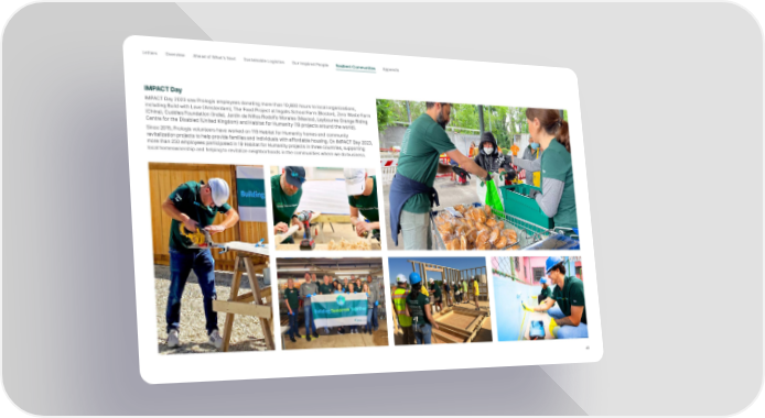 Letter s Overview Ahead of What’s Next Sustainable Logistics Our Inspired People Resilient Communities Appendix IMPACT Day IMPACT Day 2023 saw Prologis employees donating more than 10,800 hours to local organizations, including Build with Love (Amsterdam), The Food Project at Ingalls School Farm (Boston), Zero Waste Farm (China), Cuddles Foundation (India), Jardín de Niños Rodolfo Morales (Mexico), Leybourne Grange Riding Centre for the Disabled (United Kingdom) and Habitat for Humanity (19 projects around the world). Since 2015, Prologis volunteers have worked on 119 Habitat for Humanity homes and community revitalization projects to help provide families and individuals with affordable housing. On IMPACT Day 2023, more than 250 employees participated in 19 Habitat for Humanity projects in three countries, supporting local homeownership and helping to revitalize neighborhoods in the communities where we do business. 43