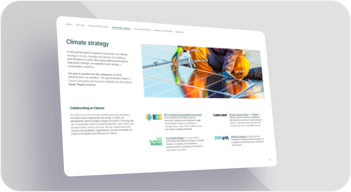 Letter s Overview Ahead of What’s Next Sustainable Logistics Our Inspired People Resilient Communities Appendix Climate strategy As the global leader in logistics real estate, our climate strategy is to site, develop and operate our buildings with efficiency in mind. We create additional emissions reductions through our operations and energy + sustainability solutions. Our goal to achieve net-zero emissions by 2040 demonstrates our ambition. This goal includes Scopes 1, 2 and 3 emissions and has been validated by the Science Based Targets initiative. Collaborating on Climate Our path to net zero includes tackling some big challenges. MIT’s Climate & Sustainability Consortium Climate Group’s EV100+ and RE100 are Innovation and collaboration will be key. In 2023, our is an academic and industry group industry groups working to accelerate development teams piloted a range of solutions, including the working to develop and implement large- the industry’s transition to zero-emission use of recyclable modular building materials, mass timber and scale climate solutions, including in medium- and heavy-duty vehicles and stronger lower-carbon concrete. And by collaborating with transportation, value chain resilience and increase the use of renewable energy. industry and academic organizations, we can accelerate our low-carbon building materials. industry’s progress and ramp up our impact: The Climate Pledge is a cross-sector ZEROGrid Initiative is building a new community launched by Prologis’ customer framework to accelerate the transition to Amazon to develop and implement a reliable and affordable zero-emissions decarbonization strategies and measure electric grid. and report on results. 22