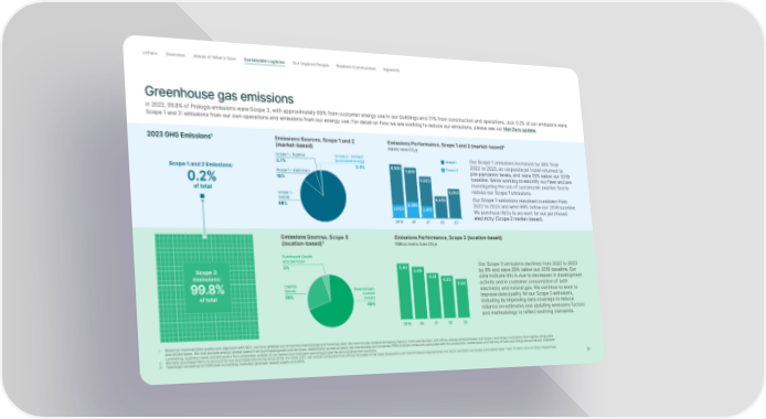 Letter s Overview Ahead of What’s Next Sustainable Logistics Our Inspired People Resilient Communities Appendix Greenhouse gas emissions In 2023, 99.8% of Prologis emissions were Scope 3, with approximately 69% from customer energy use in our buildings and 31% from construction and operations. Just 0.2% of our emissions were Scope 1 and 2: emissions from our own operations and emissions from our energy use. For detail on how we are working to reduce our emissions, please see our Net-Zero update . 2023 GHG Emissions 1 Emissions Sources, Scope 1 and 2 Emissions Performance, Scope 1 and 2 (market-based) (market-based) Metric tons CO 2 e Scope 1 – fugitive Scope 2 – indirect Scope 1 Our Scope 1 emissions increased by 36% from 3.7% purchased energy 2022 to 2023, as corporate jet travel returned to Scope 1 and 2 Emissions: 0.3% 8,100 7, 8 7 9 Scope 2 pre-pandemic levels, and were 25% below our 2019 Scope 1 – stationary baseline. We're working to electrify our fleet and are 0.2% 10% 6,025 investigating the use of sustainable aviation fuel to of total 6,063 reduce our Scope 1 emissions. Scope 1 – mobile 4,458 Our Scope 2 emissions remained consistent from 86% 2,653 2,362 2022 to 2023 and were 99% below our 2019 baseline. 2,451 We purchase RECs to account for our purchased 2019 20 21 22 23 electricity (Scope 2 market-based). Emissions Sources, Scope 3 Emissions Performance, Scope 3 (location-based) (location-based) Million metric tons CO 2 e Purchased Goods and Services Our Scope 3 emissions declined from 2022 to 2023 Scope 3 5% 5.43 5.09 by 9% and were 29% below our 2019 baseline. Our Emissions: 4.51 4.22 data indicate this is due to decreases in development Capital 3.84 activity and in customer consumption of both 99.8% Goods Downstream electricity and natural gas. We continue to work to of total 25% Leased improve data quality for our Scope 3 emissions, Assets 69% including by improving data coverage to reduce reliance on estimates and updating emissions factors and methodology to reflect evolving standards. 2019 20 21 22 23 1. Based on improved data quality and alignment with SBTi, we have updated our emissions methodology and historical data. We now include updated emissions factors; more precise fleet- and office-related emissions data; and Scope 1 and Scope 2 emissions from fugitive refrigerants and chilled water. We now exclude energy related spend from purchased goods and services. Additionally, across all years, we now exclude as immaterial: FERA (indirect emissions associated with the production, transmission and delivery of fuels and energy we purchased), employee commuting, business travel and emissions from properties outside of our owned and managed operating properties and development portfolio. 2. We have purchased RECs to account for our purchased electricity since 2019. For 2019-2021, we include emissions from offices included in the Duke acquisition, per GHG Protocol requirements. For 2022 and 2023, our Scope 2 emissions were 7 and 17 metric tons of CO2e, respectively. 3. Total does not add up to 100% due to rounding. Excludes upstream leased assets at 0.001%. 23