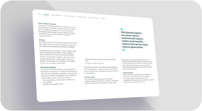 Letter s Overview Ahead of What’s Next Sustainable Logistics Our Inspired People Resilient Communities Appendix Vision, mission and values Our vision is "enduring excellence." Our mission is to be the leading logistics real estate company in terms of customer Well-planned logistics service, employee engagement, financial performance and balance sheet strength. Our core values are Integrity, real estate reduces Mentorship, Passion, Accountability, Courage and environmental impacts, Teamwork (IMPACT). creates social benefits, Strategy reduces risks and increases We develop, own, lease and manage properties in the world’s most vibrant centers of trade and commerce: markets that revenue opportunities. have high growth potential and are difficult to penetrate. By implementing this strategy, we make the global supply chain stronger and more efficient. This is consistent with environmental, social and governance principles: Efficient and well-planned logistics real estate reduces environmental impacts, creates social and economic − Weighted average net effective rent change of 61.2%; open-ended funds, five private joint ventures and two benefits, reduces risks to our business, and increases and Prologis-sponsored publicly traded funds, each with a track revenue and recruitment opportunities. − Occupancy of 98% at year-end. record of delivering industry-leading, risk-adjusted returns with a superior investor experience. At year-end 2023, Real estate operations Our 8,630-acre land bank can support an estimated $40B these vehicles comprised approximately 40% of our assets Our real estate operations include capital deployment, of future development. It allows us to build at the right time under management (AUM). development and leasing. Put simply, we determine how and in the right locations, optimizing the value we create for best to invest in properties; we develop or improve those our shareholders. Prologis Essentials properties; and then we lease them out to customers in With our Prologis Essentials platform, we address some need of logistics space. In 2023, we achieved: Strategic Capital of the most critical challenges facing our customers − $1B in acquisitions covering nearly 7 MSF across Our strategic capital business gives institutional by providing solutions in operations and energy + s ix countries; investors a unique opportunity to co-invest in the Prologis sustainability. With Essentials, our customers can maximize − $3.63B of development starts; platform. We operate 10 co-investment vehicles: three the value of the warehouse from day one. 7