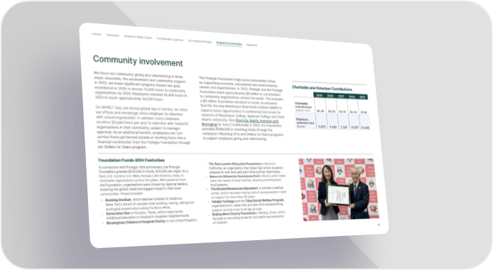 Letter s Overview Ahead of What’s Next Sustainable Logistics Our Inspired People Resilient Communities Appendix Community involvement We focus our community giving and volunteering in three The Prologis Foundation helps local communities thrive areas: education, the environment and community support. by supporting economic, educational and environmental Charitable and Volunteer Contributions In 2023, we made significant progress toward our goal, causes and organizations. In 2023, Prologis and the Prologis established in 2019, to donate 75,000 hours to community Foundation made approximately $8 million in contributions 2019 2020 2021 2022 2023 organizations by 2025: Employees donated 16,400 hours in to community organizations around the world. This included 2023 to reach approximately 54,500 hours. a $3 million Foundation donation to create an endowed Charitable fund for the new Morehouse Real Estate Institute (MREI) to contributions On IMPACT Day, our annual global day of service, we close expand career opportunities in commercial real estate for (million USD) $2.30 $8.20 $4.70 $6.48 $7. 9 2 our offices and encourage every employee to volunteer students of Morehouse College, Spelman College and Clark Employee with a local organization. In addition, every employee Atlanta University. (See Diversity, Equity, Inclusion and volunteer time receives 32 paid hours per year to volunteer with nonprofit Belonging for more.) Additionally in 2023, the Foundation (hours) 11,872 4,428 7, 3 2 4 14,557 16,406 organizations in their community, subject to manager provided $356,000 in matching funds through the approval. As an additional benefit, employees can turn company’s Matching Gifts and Dollars for Doers programs service hours performed outside of working hours into a to support employee giving and volunteering. financial contribution from the Prologis Foundation through our Dollars for Doers program. Foundation Funds 40th Festivities In connection with Prologis’ 40th anniversary, the Prologis − The San Leandro Education Foundation in Northern Foundation granted $240,000 in funds, $40,000 per region (U.S. California, an organization that helps high school students East, U.S. Central, U.S. West, Europe, Latin America, Asia), to prepare for and land paid part-time summer internships. charitable organizations across the globe. With guidance from − Banco de Alimentos Associacao Civil in Brazil, which helps the Foundation, organizations were chosen by regional leaders, meet the needs of local families, beyond providing basic ensuring the grants made the biggest impact in their local food baskets. communities. These included: − The Kinderhilfezentrum Düsseldorf , a children’s welfare center, which has been taking care of young people in need − Rocking the Boat , which teaches children in the Bronx of support for more than 50 years. ( New York) the art of wooden boat building, rowing, sailing and − Yahaba Yurikago and the Tokai Social Welfare Program, ecological preservation along the Bronx River. organizations in Japan that provide child care/parenting − Generation One in Houston, Texas, which helps tackle support and services to all age groups. childhood education in Houston’s roughest neighborhoods. − Beijing Meet Charity Foundation in Beijing, China, which − Birmingham Children’s Hospital Charity in the United Kingdom. focuses on providing funds for the health and education o f children. 42