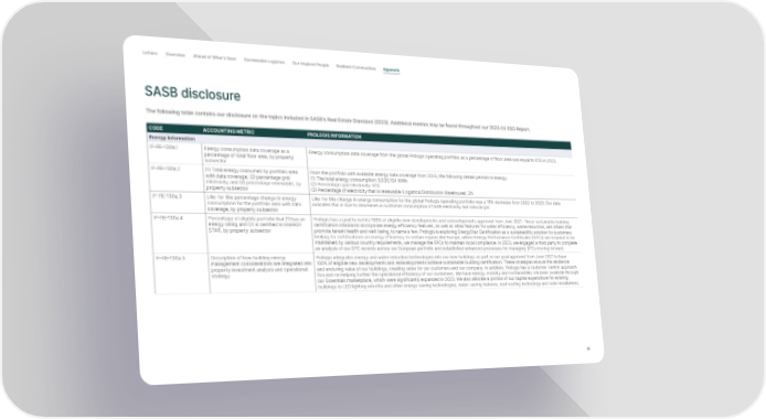 Letter s Overview Ahead of What’s Next Sustainable Logistics Our Inspired People Resilient Communities Appendix SASB disclosure The following table contains our disclosure on the topics included in SASB’s Real Estate Standard (2023). Additional metrics may be found throughout our 2023-24 ESG Report. CODE ACCOUNTING METRIC PROLOGIS INFORMATION Energy Information IF-RE-130a.1 Energy consumption data coverage as a Energy consumption data coverage from the global Prologis operating portfolio as a percentage of floor area was equal to 65% in 2023. percentage of total floor area, by property subsector IF-RE-130a.2 (1) Total energy consumed by portfolio area From the portfolio with available energy data coverage from 2023, the following details pertain to energy: with data coverage, (2) percentage grid (1) The total energy consumption: 9,635,104 MWh electricity, and (3) percentage renewable, by (2) Percentage grid electricity: 61% property subsector (3) Percentage of electricity that is renewable (Logistics/Distribution Warehouse): 3% IF-RE-130a.3 Like-for-like percentage change in energy Like-for-like change in energy consumption for the global Prologis operating portfolio was a 16% decrease from 2022 to 2023. Our data consumption for the portfolio area with data indicates this is due to decreases in customer consumption of both electricity and natural gas. coverage, by property subsector IF-RE-130a.4 Percentage of eligible portfolio that (1) has an Prologis has a goal to certify 100% of eligible new developments and redevelopments approved from June 2021. These sustainable building energy rating and (2) is certified to ENERGY certification standards incorporate energy efficiency features, as well as other features for water efficiency, waste reduction, and others that STAR, by property subsector promote tenant health and well-being, to name a few. Prologis is exploring EnergyStar Certification as a sustainability solution for customers looking for certifications on energy efficiency. In certain regions like Europe, where Energy Performance Certificates (EPCs) are required to be maintained by various country requirements, we manage the EPCs to maintain local compliance. In 2023, we engaged a third party to complete an analysis of our EPC records across our European portfolio and established enhanced processes for managing EPCs moving forward. IF-RE-130a.5 Description of how building energy Prologis integrates energy and water reduction technologies into our new buildings as part or our goal approved from June 2021 to have management considerations are integrated into 100% of eligible new developments and redevelopments achieve sustainable building certification. These strategies ensure the resilience property investment analysis and operational and enduring value of our buildings, creating value for our customers and our company. In addition, Prologis has a customer-centric approach strategy focused on helping further the operational efficiency of our customers. We have energy, mobility and sustainability solutions available through our Essentials marketplace, which were significantly expanded in 2023. We also allocate a portion of our capital expenditure for existing buildings to LED lighting retrofits and other energy-saving technologies, water-saving features, cool roofing technology and solar installations. 58