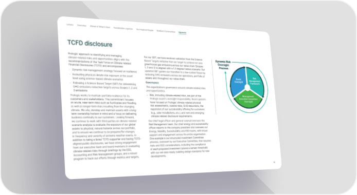 Letter s Overview Ahead of What’s Next Sustainable Logistics Our Inspired People Resilient Communities Appendix TCFD disclosure Prologis’ approach to identifying and managing For our SBT, we have received validation from the Science Dynamic Risk climate-related risks and opportunities aligns with the Based Targets initiative that our target to achieve net zero Oversight recommendations of the Task Force on Climate-related greenhouse gas emissions across our value chain (Scopes Process Financial Disclosures (TCFD) and encompasses: 1, 2 and 3) is aligned with a 1.5 degree Celsius scenario. Our − Dynamic risk management strategy focused on resilience updated SBT guides our transition to a low-carbon future by − Evaluating physical climate risk exposure at the asset reducing GHG emissions across our operations, portfolio of Board Risk level using science-based climate scenarios assets and throughout our value chain. Oversight Management Governance Framework − Following a Science Based Target (SBT) for determining The organization’s governance around climate-related risks GHG emissions reduction targets across Scopes 1, 2 and and opportunities. 3 emissions Prologis works to maintain portfolio resilience for its − Risk, including climate-related risks, are part of the Management customers and stakeholders. This commitment focuses Prologis board’s oversight responsibility. Board updates Executive Committee have focused on Prologis’ climate-related physical Oversight on acute, near-term risks such as hurricanes and flooding risk assessments, coastal risks, GHG reductions, the as well as longer-term risks resulting from the changing expansion of our sustainability offering for customers climate. We site, develop and maintain assets with a long- (e.g., solar installations, etc.), and new and emerging term ownership horizon in mind and a focus on delivering climate-related disclosure requirements. business continuity to our customers. Looking forward, we continue to work with third parties on climate-related Our chief legal officer and general counsel oversees the scenario analysis to evaluate the exposure of our global Risk Management team. Our chief energy and sustainability assets to physical, natural hazards across our portfolio, officer reports to the company president and oversees our and to ensure we continue to be prepared for changes Energy, Mobility, Sustainability and ESG teams, with broad in frequency and severity of extreme weather events. In support and engagement across the entire organization. addition to being a listed TCFD supporter and having TCFD- One example is our structured Investment Committee aligned public disclosures, we have strong engagement process, overseen by our Executive Committee, that requires from our executive team and board members in evaluating risks and ESG considerations, including the compliance climate-related risks through briefings by the ESG, of each proposed investment (above a certain threshold) Accounting and Risk Management groups, and a robust with our net-zero-ready building design standards for new program to track our efforts through metrics and targets. developments. 61