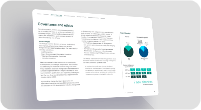 Letter s Overview Ahead of What’s Next Sustainable Logistics Our Inspired People Resilient Communities Appendix Governance and ethics Our culture, policies, systems and processes guide how of climate change risks and performance against our ESG Board Diversity 1 we do business: We focus on serving our customers and goals, including our net-zero goal. In 2023, climate- or encourage integrity, accountability and sound decision- energy-related matters were on the agenda at every Gender Ethnic and Geographic making. We set ambitious goals and base decisions on meeting of both the Board Governance and Nomination Asian/Asian data—a continuing area of focus. Committee and the full board. Other board committees American/ provide oversight on relevant ESG topics: Women West Asian/ African Board oversight − Our Audit Committee oversees the development of 27% Middle Eastern American 18% 9% The Prologis board of directors serves our stockholders’ data systems and disclosures to comply with emerging best interests, sets company strategy and provides regulation. independent and experienced oversight. The board has four − Our Talent and Compensation Committee oversees standing committees: human capital development and diversity, equity, − Audit Committee inclusion and belonging (DEIB) performance, initiatives − Board Governance and Nomination Committee and related risks. − Talent and Compensation Committee − Executive Committee The Prologis board believes that diversity promotes robust Men White/Caucasian discussion and the consideration of a range of viewpoints. 73% 73% Ninety-one percent of the members of our board qualify Our board governance guidelines state: as independent, according to the principles and standards Number of Directors established by the New York Stock Exchange. Our latest In any formal search for new directors, the Board by years of tenure Proxy Statement describes the rights and responsibilities of Governance and Nomination Committee will consider, our lead independent director and provides detail on each and will instruct any third-party search firm to include, 0-6 Years board member’s qualifications and experience, including the candidates from diverse backgrounds, including in its 6-13 Years fact that two of our board members have experience with initial list both gender and racial/ethnic diversity. climate, energy or ESG. 13 Years By committee charter, the Board Governance and Nomination Committee oversees ESG matters and updates 7 new directors the full board on ESG developments, including management in the last nine years 1. As of May 10, 2024. 16