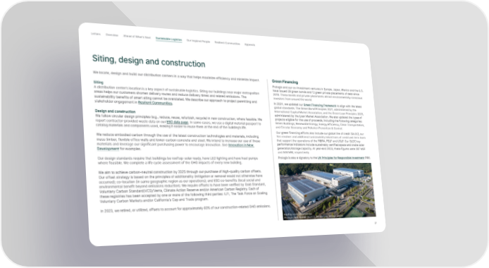 Letter s Overview Ahead of What’s Next Sustainable Logistics Our Inspired People Resilient Communities Appendix Siting, design and construction We locate, design and build our distribution centers in a way that helps maximize efficiency and minimize impact. Green Financing Siting Prologis and our co-investment ventures in Europe, Japan, Mexico and the U.S. A distribution center’s location is a key aspect of sustainable logistics. Siting our buildings near major metropolitan have issued 29 green bonds and 12 green private placements of debt since 2018. These bonds and private placements attract environmentally conscious areas helps our customers shorten delivery routes and reduce delivery times and related emissions. The investors from around the world. sustainability benefits of smart siting cannot be overstated. We describe our approach to project permitting and In 2024, we updated our Green Financing Framework to align with the latest stakeholder engagement in Resilient Communities . global standards: The Green Bond Principles 2021, administered by the International Capital Market Association, and the Green Loan Principles 2023, Design and construction administered by the Loan Market Association. We also updated the types of We follow circular design principles (e.g., reduce, reuse, refurbish, recycle) in new construction, where feasible. We projects eligible for the use of proceeds, including the following categories: report contractor-provided waste data on our ESG data page . In some cases, we use a digital material passport to Green Buildings; Renewable Energy; Energy Efficiency; Clean Transportation; catalog materials and components used, making it easier to reuse them at the end of the building’s life. and Circular Economy and Pollution Prevention & Control. Our green financing efforts also include our global line of credit (GLOC), our We reduce embodied carbon through the use of the latest construction technologies and materials, including Yen revolver and additional sustainability linked lines of credit and term loans mass timber, flexible office walls and lower-carbon concrete and steel. We intend to increase our use of these that support the operations of the FIBRA, PELF and USLF. Our GLOC key materials and leverage our significant purchasing power to encourage innovation. See Innovation in New performance indicators include sustainably certified space and onsite solar Development for examples. generation/storage capacity. At year-end 2023, these figures were 287 MSF and 506 MW, respectively. Our design standards require that buildings be rooftop-solar ready, have LED lighting and have heat pumps Prologis is also a signatory to the UN Principles for Responsible Investment (PRI). where feasible. We complete a life cycle assessment of the GHG impacts of every new building. We aim to achieve carbon-neutral construction by 2025 through our purchase of high-quality carbon offsets. Our offset strategy is based on the principles of additionality (mitigation or removal would not otherwise have occurred); co-location (in same geographic region as our operations); and ESG co-benefits (local social and environmental benefit beyond emissions reduction). We require offsets to have been verified by Gold Standard, Voluntary Carbon Standard(VCS)/Verra, Climate Action Reserve and/or American Carbon Registry. Each of these registries has been accepted by one or more of the following third parties: ILFI, The Task Force on Scaling Voluntary Carbon Markets and/or California’s Cap and Trade program. In 2023, we retired, or utilized, offsets to account for approximately 60% of our construction-related GHG emissions. Rooftop solar installations, Prologis Park Sendai-Izumi 2, Sendai City, Miyagi, Japan. 27