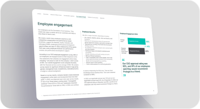 Letter s Overview Ahead of What’s Next Sustainable Logistics Our Inspired People Resilient Communities Appendix Employee engagement Our employees are the foundation of our business. They Employee Benefits Employee Engagement 2023 create new ways to better serve our customers and help us stay ahead of what’s next. We offer a range of benefits, depending on location: − Life, medical, disability, dental, vision and identify theft Prologis We create a world-class employee experience with insurance. Score Engagement Survey 88% competitive compensation and performance-based − Paid time off, bereavement time off, parental and incentives; support for diversity, equity, inclusion and partner leave and company-sponsored volunteer time. belonging (DEIB); challenging professional development − Telemedicine, including virtual exercise and physical +8% therapy services. opportunities; and best-in-class collaborative office space. − An employee assistance program and a mental health Financial Each year, every employee receives two performance services program. Services Engagement Survey 80% reviews and professional development support. − Fertility/surrogacy and adoption assistance and Sector Score counseling. (average) According to our 2023 employee engagement survey, 88% of − Flexible spending and health savings accounts. our employees are engaged based on their responses to the − Backup childcare assistance. − Free or subsidized public transit passes, which help five statements that comprise our engagement driver index, reduce greenhouse gas emissions from commuting. including "I am proud to work for this company," which scores − Health and financial wellness coaching. at 95%. Our overall engagement score compares favorably − Pension and/or 401(K) benefits. Our CEO approval rating was with the financial services sector average of 80%. We analyze − Tuition reimbursement for continuing education. 95%, and 91% of our employees survey results for significant differences based on age group, gender, management level, race/ethnicity, nationality/country said they would recommend of origin or cultural background. to work on improving the third area: “how we share Prologis to a friend. knowledge across business lines.” (Our score remained Based on survey results, company leaders create employee consistent at 68%.) engagement action plans and incorporate them into their goals. In 2023, we improved year-over-year survey results In 2023, our regrettable turnover was 1.0% and our non- in two of our three lowest-scoring areas: “manageable regrettable turnover was 8.4%. As of December 31, 2023, our workload” (from 67% to 72%) and “employees rewarded CEO approval rating on Glassdoor was 95%, and 91% of our for performance” (from 64% to 70%). In 2024, we continue employees said they would recommend Prologis to a friend. 1. Regrettable turnover is defined as “eligible for rehire in the same role.” Non-regrettable turnover is defined as “ineligible for rehire in the same role.” 32