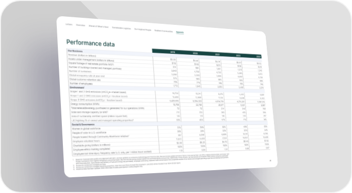 Letter s Overview Ahead of What’s Next Sustainable Logistics Our Inspired People Resilient Communities Appendix Performance data 2019 2020 2021 2022 2023 Our Business Revenue (dollars in billions) $3.33 $4.44 $4.76 $5.97 $8.02 Assets under management (dollars in billions) $118 $148 $215 $196 $219 Square footage of real estate portfolio (MSF) 814 984 1,001 1,213 1,242 Number of buildings (owned and managed portfolio) 3,840 4,703 4,735 5,495 5,613 Number of customers 5,000 5,500 5,800 6,600 6,700 Global occupancy rate at year-end 97% 96% 98% 98% 98% Global customer retention rate 79% 77% 74% 78% 74% Number of employees 1,713 1,945 2,053 2,466 2, 5 74 Environment 1 Scope 1 and 2 GHG emissions (mtCO 2 e—market based) 10,753 10,241 8,476 4,465 6,081 Scope 1 and 2 GHG emissions (mtCO 2 e—location based) 13,493 12,869 11,135 6,498 8,302 Scope 3 GHG emissions (mtCO 2 e—location based) 5,429,592 5,094,320 4,514,735 4,215,247 3,841,252 Energy consumption (MWh) 18,708 22,786 20,671 9,831 9,967 Total renewable energy purchased or generated for our operations (MWh) 72 72 214 346 765 Solar and storage capacity (in MW) 2 212 252 285 405 506 Area of sustainably certified space (million square feet) 145 170 195 235 287 LED lighting (% of owned and managed operating properties) 3 33% 42% 57% 71% 74% Social & Governance Women in global workforce 51% 50% 50% 49% 50% People of color in U.S. workforce 28% 29% 32% 32% 34% People trained through Community Workforce Initiative 4 597 4,036 6,809 10,119 8,760 Employee volunteer hours 11,872 4,428 7, 3 2 4 14,557 16,406 Charitable giving (dollars in millions) $2.30 $8.20 $4.70 $6.48 $ 7. 9 2 Employee ethics training completed 100% 100% 100% 100% 100% Employee lost time injury frequency rate (U.S. only, per 1 million hours worked) 1.10 0.94 1.34 0.68 0.67 1. Based on improved data quality and alignment with SBTi, we have updated our emissions methodology and historical data. We now include updated emissions factors; more precise fleet- and office-related emissions data; and Scope 1 and Scope 2 emissions from fugitive refrigerants and chilled water. We now exclude energy related spend from purchased goods and services. Additionally, across all years, we now exclude as immaterial: FERA (indirect emissions associated with the production, transmission and delivery of fuels and energy we purchased), employee commuting, business travel and emissions from properties outside of our owned and managed operating properties and development portfolio. 2. Across our owned and managed portfolio. 3. Across our owned and managed operating properties. Data from a portfolio of properties acquired in June 2023 will be included in our 2024-25 ESG report. 4. Historical data has been updated. 2020-2023 data includes participants in online program only. 45