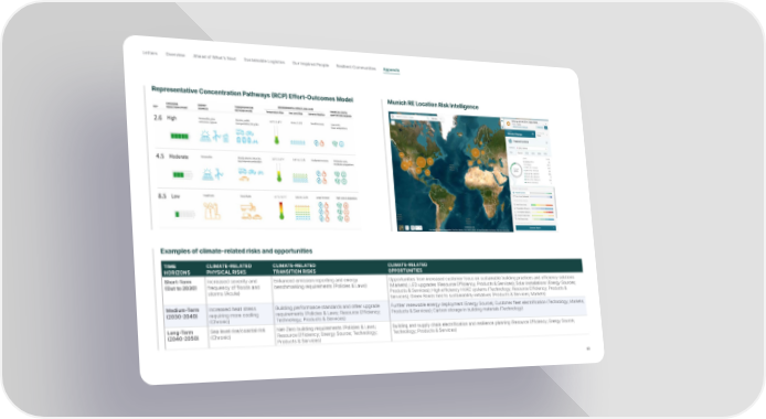 Letter s Overview Ahead of What’s Next Sustainable Logistics Our Inspired People Resilient Communities Appendix Representative Concentration Pathways (RCP) Effort-Outcomes Model Munich RE Location Risk Intelligence Examples of climate-related risks and opportunities TIME CLIMATE-RELATED CLIMATE-RELATED CLIMATE-RELATED HORIZONS PHYSICAL RISKS TRANSITION RISKS OPPORTUNITIES Short-Term Increased severity and Enhanced emission reporting and energy Opportunities from increased customer focus on sustainable building practices and efficiency solutions (Out to 2030) frequency of floods and benchmarking requirements (Policies & Laws) (Markets); LED upgrades (Resource Efficiency; Products & Services); Solar installations (Energy Sources; storms (Acute) Products & Services); High efficiency HVAC systems (Technology; Resource Efficiency; Products & Services); Green Bonds tied to sustainability initiatives (Products & Services; Markets) Medium-Term Increased heat stress Building performance standards and other upgrade Further renewable energy deployment (Energy Source); Customer fleet electrification (Technology; Markets; (2030-2040) requiring more cooling requirements (Policies & Laws; Resource Efficiency; Products & Services); Carbon storage in building materials (Technology) (Chronic) Technology; Products & Services) Long-Term Sea level rise/coastal risk Net-Zero building requirements (Policies & Laws; Building and supply chain electrification and resilience planning (Resource Efficiency; Energy Source; (2040-2050) (Chronic) Resource Efficiency; Energy Source; Technology; Technology; Products & Services) Products & Services) 63