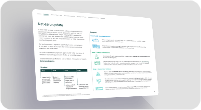 Letter s Overview Ahead of What’s Next Sustainable Logistics Our Inspired People Resilient Communities Appendix Net-zero update In June 2022, we made a commitment to achieve net-zero greenhouse Progress gas emissions across our value chain (Scopes 1, 2 and 3) by 2040. In early 2024, the Science Based Targets initiative (SBTi) validated this Scope 1 and 2 – Operational Emissions: commitment, along with our near-term (2030) targets: to reduce Scope 1 and 2 emissions by 90% and Scope 3 emissions by 27.5%. Our baseline We’re working to electrify the Prologis fleet, with a goal of 100% by year-end 2030. This will year for all targets is 2019. 1 help us reduce emissions from mobile fuels. Our goal represents a significant opportunity to serve our customers We purchase renewable energy credits (RECs) to cover 100% of our annual office electricity. in new ways, as many of them are also working to decarbonize their This has helped us achieve zero emissions from office electricity. operations and value chains. Scope 1 and 2 emissions represent approximately 0.2%—and Scope 3 Scope 3 – Supply Chain Emissions: emissions represent approximately 99.8%—of our total emissions. We complete life cycle assessments (LCAs) to determine the embodied and operational emissions of every new development. Detail on emissions performance and our climate strategy can be found in Sustainable Logistics . We participate in a wide range of industry partnerships and collaborations (see Climate Strategy for examples) to identify ways to reduce emissions from our supply chain. This will help us reduce embodied carbon emissions, including from the production of concrete and steel. Timeline 2022 2025 2030 2040 Scope 3 – Leased Asset Emissions: We have more than 500 MW of solar and storage capacity across our portfolio. When this energy is used by our customers, we reduce our emissions from downstream leased assets (emissions from the energy our customers purchase and use). Committed to Deploy 1 Achieve a 90% net zero and GW of solar reduction in We implemented net-zero-ready building design standards for 60% of new builds in 2023, with a goal launched key and storage Scope 1 and 2 to reach 100% in 2024. Net-zero-ready building design standards include solar-ready roofs, efficient partnerships capacity emissions LED lighting and, where feasible, electric heat pumps in place of natural gas-fired heating systems. Achieve a 27.5% Achieve net-zero reduction in emissions across Scope 3 emissions Scopes 1, 2 and 3 We’ve installed efficient LED lighting across 74% of our portfolio , 2 also reducing emissions from downstream leased assets (emissions from the energy our customers purchase and use). 1. The target boundary includes land-related emissions and removals from bioenergy feedstocks. 2. Across our owned and managed operating properties. Does not include a portfolio of properties acquired in June 2023. 10