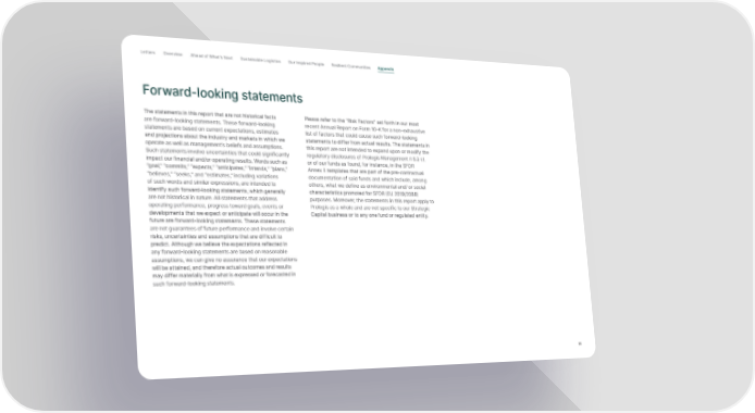 Letter s Overview Ahead of What’s Next Sustainable Logistics Our Inspired People Resilient Communities Appendix Forward-looking statements The statements in this report that are not historical facts Please refer to the “Risk Factors” set forth in our most are forward-looking statements. These forward-looking recent Annual Report on Form 10-K for a non-exhaustive statements are based on current expectations, estimates list of factors that could cause such forward-looking and projections about the industry and markets in which we statements to differ from actual results. The statements in operate as well as management’s beliefs and assumptions. this report are not intended to expand upon or modify the Such statements involve uncertainties that could significantly regulatory disclosures of Prologis Management II S.à r.l. impact our financial and/or operating results. Words such as or of our funds as found, for instance, in the SFDR ”goal,” “commits,” “expects,” “anticipates,” “intends,” “plans,” Annex II templates that are part of the pre-contractual “believes,” “seeks,” and “estimates,” including variations documentation of said funds and which include, among of such words and similar expressions, are intended to others, what we define as environmental and/ or social identify such forward-looking statements, which generally characteristics promoted for SFDR (EU 2019/2088) are not historical in nature. All statements that address purposes. Moreover, the statements in this report apply to operating performance, progress toward goals, events or Prologis as a whole and are not specific to our Strategic developments that we expect or anticipate will occur in the Capital business or to any one fund or regulated entity. future are forward-looking statements. These statements are not guarantees of future performance and involve certain risks, uncertainties and assumptions that are difficult to predict. Although we believe the expectations reflected in any forward-looking statements are based on reasonable assumptions, we can give no assurance that our expectations will be attained, and therefore actual outcomes and results may differ materially from what is expressed or forecasted in such forward-looking statements. 65