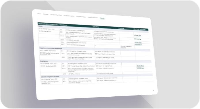 Letter s Overview Ahead of What’s Next Sustainable Logistics Our Inspired People Resilient Communities Appendix GRI STANDARD/OTHER SOURCE DISCLOSURE LOCATION OMISSION ADDITIONAL RESOURCES Waste GRI 3: Material Topics 2021 3-3 3-3 Management of material topics ESG Report: ESG Materiality Assessment GRI 306: Waste 2020 306-1 306-1 Waste generation and significant waste- ESG Report: Siting, design and construction; ESG Data Page related impacts Building certification; SASB disclosure 306-2 306-2 Management of significant waste-related ESG Report: Siting, design and construction; ESG Data Page impacts Building certification; SASB disclosure 306-3 306-3 Waste generated ESG Data Page 306-4 306-4 Waste diverted from disposal ESG Data Page 306-5 306-5 Waste directed to disposal — Information unavailable/ incomplete Supplier environmental assessment GRI 3: Material Topics 2021 3-3 3-3 Management of material topics ESG Report: ESG Materiality Assessment GRI 308: Supplier Environmental 308-1 308-1 New suppliers that were screened using ESG Report: Supply chain responsibility Assessment 2016 environmental criteria 308-2 308-2 Negative environmental impacts in the ESG Report: Collaborating on climate supply chain and actions taken Employment GRI 3: Material Topics 2021 3-3 3-3 Management of material topics ESG Report: ESG Materiality Assessment GRI 401: Employment 2016 401-1 401-1 New employee hires and employee turnover ESG Report: Our Inspired People ESG Data Page 401-2 401-2 Benefits provided to full-time employees ESG Report: Employee Engagement ESG Data Page that are not provided to temporary or part-time employees 401-3 401-3 Parental leave ESG Report: Our Inspired People Labor/management relations GRI 3: Material Topics 2021 3-3 3-3 Management of material topics ESG Report: ESG Materiality Assessment GRI 402: Labor/Management 402-1 402-1 Minimum notice periods regarding ESG Report: Stakeholder engagement Relations 2016 operational changes 54