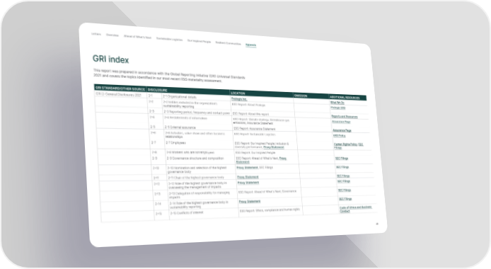 Letter s Overview Ahead of What’s Next Sustainable Logistics Our Inspired People Resilient Communities Appendix GRI index This report was prepared in accordance with the Global Reporting Initiative (GRI) Universal Standards 2021 and covers the topics identified in our most recent ESG materiality assessment. GRI STANDARD/OTHER SOURCE DISCLOSURE LOCATION OMISSION ADDITIONAL RESOURCES GRI 2: General Disclosures 2021 2-1 2-1 Organizational details Prologis Inc. What We Do 2-2 2-2 Entities included in the organization’s ESG Report: About Prologis Prologis ESG sustainability reporting 2-3 2-3 Reporting period, frequency and contact point ESG Report: About this report Reports and Resources 2-4 2-4 Restatements of information ESG Report: Climate strategy; Greenhouse gas Assurance Page emissions; Assurance Statement 2-5 2-5 External assurance ESG Report: Assurance Statement Assurance Page 2-6 2-6 Activities, value chain and other business ESG Report: Sustainable Logistics ESG Policy relationships 2-7 2-7 Employees ESG Report: Our Inspired People; Inclusion & Human Rights Policy ; SEC diversity performance, Proxy Statement Filings 2-8 2-8 Workers who are not employees ESG Report: Our Inspired People 2-9 2-9 Governance structure and composition ESG Report: Ahead of What's Next, Proxy SEC Filings Statement 2-10 2-10 Nomination and selection of the highest Proxy Statement , SEC Filings SEC Filings governance body 2-11 2-11 Chair of the highest governance body Proxy Statement SEC Filings 2-12 2-12 Role of the highest governance body in Proxy Statement SEC Filings overseeing the management of impacts 2-13 2-13 Delegation of responsibility for managing ESG Report: Ahead of What's Next; Governance SEC Filings impacts 2-14 2-14 Role of the highest governance body in Proxy Statement SEC Filings sustainability reporting 2-15 2-15 Conflicts of interest ESG Report: Ethics, compliance and human rights Code of Ethics and Business Conduct 49