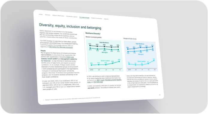 Letter s Overview Ahead of What’s Next Sustainable Logistics Our Inspired People Resilient Communities Appendix Diversity, equity, inclusion and belonging DEIB is important to our mission to be the leading Workforce Diversity 1 logistics real estate company. Our workforce should look like the communities where we do business, and our Women (companywide) People of Color (U.S.) priorities should reflect the needs of those communities. Our DEIB strategy is supported by three pillars: people, Total Workforce Total Workforce 34% procurement and philanthropy. Our Global DEIB Steering 51% 50% 50% 49% 50% 32% 32% Committee guides this strategy, and our CEO is a 28% 29% signatory to CEO Action for Diversity & Inclusion . 29% 47% 45% 46% 44% 45% 25% 27% People Managers 23% 24% We recognize the importance of inclusion and diverse Managers representation at every level of our organization. We partner with organizations—including Urban Land 15% Institute , NAIOP , NAREIT and Management Leadership Senior Leaders 23% for Tomorrow —to stay informed of workforce trends, 20% 8% Senior Leaders 9% identify areas of opportunity and expand our pool of 16% 17% 17% 6% 6% candidates. As an example, Prologis leaders mentor members of under-represented groups at annual NAIOP I-CON conferences and participate in the organization’s 2019 20 21 22 23 2019 20 21 22 23 “Inclusion in Commercial Real Estate” scholarship program. More than 75 mentees have graduated from the program, and 15 students received scholarships at the most recent conference. In 2024, we continue to work to improve representation bonus and long-term incentives, and was reviewed by at our senior leadership level. Additional information may our executive committee and board of directors. Results At year-end 2023, 50% of our employees, 45% of our be found in our EEO-1 report, Bloomberg Gender Equality indicate that after controlling for relevant factors, women managers and 23% of our senior leaders were women. At Index and ESG Data page . (globally) and people of color (in the U.S.) were paid within year-end 2023, 34% of our U.S. employees, 29% of our +/-3% of their male and white peers. If we find differences U.S. managers and 15% of our U.S.-based senior leaders In 2024, we retained a third party to conduct our annual in compensation not explained by relevant job factors, we were people of color. pay equity analysis. This analysis included base salary, adjust compensation accordingly. 1. "Managers" includes managers, directors and vice presidents. "Senior leaders" includes those at or above the senior vice president level. 34