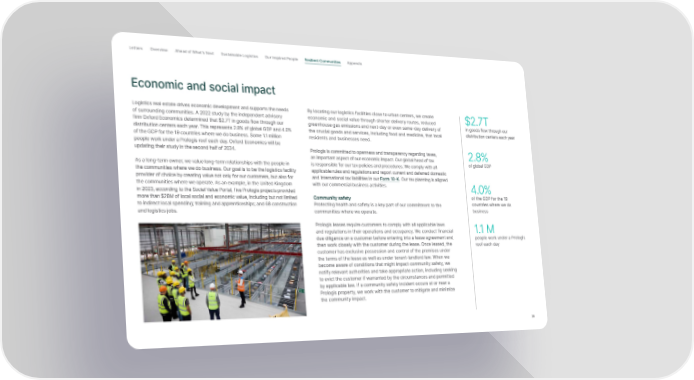 Letter s Overview Ahead of What’s Next Sustainable Logistics Our Inspired People Resilient Communities Appendix Economic and social impact Logistics real estate drives economic development and supports the needs By locating our logistics facilities close to urban centers, we create $2.7T of surrounding communities. A 2022 study by the independent advisory economic and social value through shorter delivery routes, reduced firm Oxford Economics determined that $2.7T in goods flow through our greenhouse gas emissions and next-day or even same-day delivery of in goods flow through our distribution centers each year. This represents 2.8% of global GDP and 4.0% the crucial goods and services, including food and medicine, that local distribution centers each year of the GDP for the 19 countries where we do business. Some 1.1 million residents and businesses need. people work under a Prologis roof each day. Oxford Economics will be updating their study in the second half of 2024. Prologis is committed to openness and transparency regarding taxes, 2.8% an important aspect of our economic impact. Our global head of tax of global GDP As a long-term owner, we value long-term relationships with the people in is responsible for our tax policies and procedures. We comply with all the communities where we do business. Our goal is to be the logistics facility applicable rules and regulations and report current and deferred domestic provider of choice by creating value not only for our customers, but also for and international tax liabilities in our Form 10-K . Our tax planning is aligned the communities where we operate. As an example, in the United Kingdom with our commercial business activities. 4.0% in 2023, according to the Social Value Portal, five Prologis projects provided more than $28M of local social and economic value, including but not limited Community safety of the GDP for the 19 to indirect local spending; training and apprenticeships; and 68 construction Protecting health and safety is a key part of our commitment to the countries where we do and logistics jobs. communities where we operate. business Prologis leases require customers to comply with all applicable laws and regulations in their operations and occupancy. We conduct financial 1.1 M due diligence on a customer before entering into a lease agreement and people work under a Prologis then work closely with the customer during the lease. Once leased, the roof each day customer has exclusive possession and control of the premises under the terms of the lease as well as under tenant-landlord law. When we become aware of conditions that might impact community safety, we notify relevant authorities and take appropriate action, including seeking to evict the customer if warranted by the circumstances and permitted by applicable law. If a community safety incident occurs at or near a Prologis property, we work with the customer to mitigate and minimize the community impact. 39