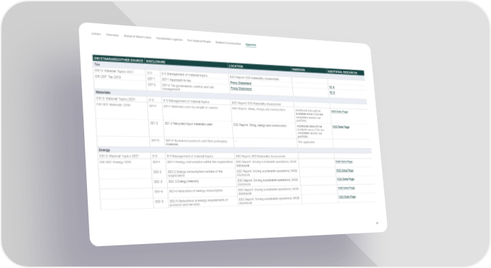 Letter s Overview Ahead of What’s Next Sustainable Logistics Our Inspired People Resilient Communities Appendix GRI STANDARD/OTHER SOURCE DISCLOSURE LOCATION OMISSION ADDITIONAL RESOURCES Tax GRI 3: Material Topics 2021 3-3 3-3 Management of material topics ESG Report: ESG Materiality Assessment GRI 207: Tax 2019 207-1 207-1 Approach to tax Proxy Statement 10-K 207-2 207-2 Tax governance, control, and risk Proxy Statement 10-K management Materials GRI 3: Material Topics 2021 3-3 3-3 Management of material topics ESG Report: ESG Materiality Assessment GRI 301: Materials 2016 301-1 301-1 Materials used by weight or volume ESG Report: Siting, design and construction Additional data will be ESG Data Page available once LCAs are completed across our portfolio. 301-2 301-2 Recycled input materials used ESG Report: Siting, design and construction Additional data will be ESG Data Page available once LCAs are completed across our portfolio. 301-3 301-3 Reclaimed products and their packaging — Not applicable materials Energy GRI 3: Material Topics 2021 3-3 3-3 Management of material topics ESG Report: ESG Materiality Assessment GRI 302: Energy 2016 302-1 302-1 Energy consumption within the organization ESG Report: Driving sustainable operations; SASB ESG Data Page disclosure 302-2 302-2 Energy consumption outside of the ESG Report: Driving sustainable operations; SASB ESG Data Page organization disclosure 302-3 302-3 Energy intensity ESG Report: Driving sustainable operations; SASB ESG Data Page disclosure 302-4 302-4 Reduction of energy consumption ESG Report: Driving sustainable operations; SASB ESG Data Page disclosure 302-5 302-5 Reductions in energy requirements of ESG Report: Driving sustainable operations; SASB ESG Data Page products and services disclosure 52
