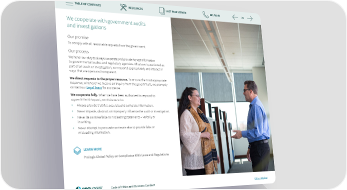 TABLE OF CONTENTS RESOURCES LAST PAGE VIEWED HELPLINE 29 We cooperate with government audits and investigations Our promise To comply with all reasonable requests from the government Our process We honor our duty to always cooperate and provide honest information to governmental bodies and regulatory agencies. Whenever questioned as part of an audit or investigation, we respond appropriately and interact in ways that are open and transparent. We direct requests to the proper resource. To ensure the most appropriate response, whenever we receive an inquiry from the government, we promptly contact our Legal Team for assistance. We cooperate fully. When we have been authorized to respond to a government request, we make sure to: + Always provide truthful, accurate and complete information. + Never impede, obstruct or improperly in昀氀uence the audit or investigation. + Never lie or make false or misleading statements – verbally or in writing. + Never attempt to persuade someone else to provide false or misleading information. LEARN MORE Prologis Global Policy on Compliance With Laws and Regulations Code of Ethics and Business Conduct Ethics Helpline