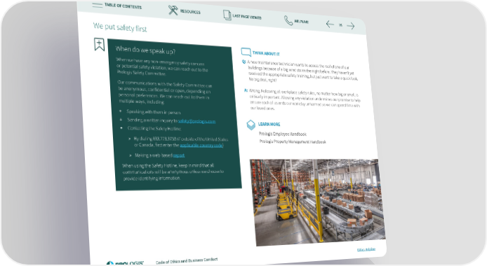 TABLE OF CONTENTS RESOURCES LAST PAGE VIEWED HELPLINE 15 We put safety 昀椀rst When do we speak up? THINK ABOUT IT Q: A n ew maintenance technician wants to access the roof of one of our When we have any non-emergency safety concern buildings because of a big wind storm the night before. They haven’t yet or potential safety violation, we can reach out to the received the appropriate safety training, but just want to take a quick look. Prologis Safety Committee. No big deal, right? Our communications with the Safety Committee can A: Wrong. Following all workplace safety rules, no matter how big or small, is be anonymous, con昀椀dential or open, depending on critically important. Allowing any violation undermines our promise to help personal preferences. We can reach out to them in ensure each of us ends our workday unharmed so we can spend time with multiple ways, including: our loved ones. + Speaking with them in person + Sending a written inquiry to safety@prologis.com LEARN MORE + Contacting the Safety Hotline: Prologis Employee Handbook » By dialing 833.723.3753 (if outside of the United States Prologis Property Management Handbook or Canada, 昀椀rst enter the applicable country code) » Making a web-based report When using the Safety Hotline, keep in mind that all communications will be anonymous unless we choose to provide identifying information. Code of Ethics and Business Conduct Ethics Helpline
