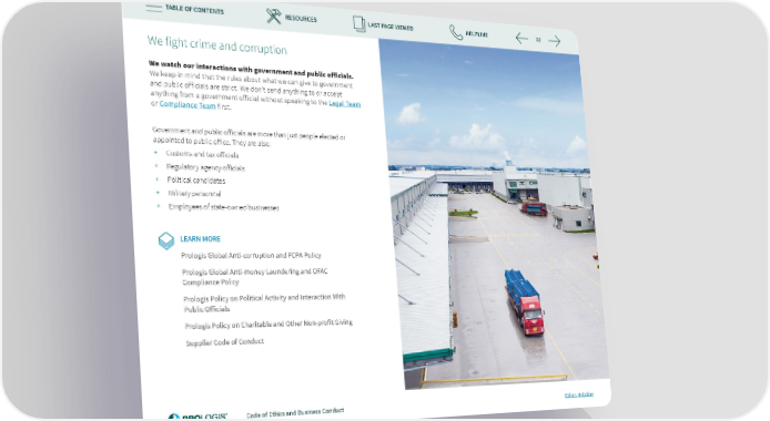 TABLE OF CONTENTS RESOURCES LAST PAGE VIEWED HELPLINE 32 We 昀椀ght crime and corruption We watch our interactions with government and public officials. We keep in mind that the rules about what we can give to government and public officials are strict. We don’t send anything to or accept anything from a government official without speaking to the Legal Team or Compliance Team first. Government and public o昀昀icials are more than just people elected or appointed to public o昀昀ice. They are also: + Customs and tax o昀昀icials + Regulatory agency o昀昀icials + Political candidates + Military personnel + Employees of state-owned businesses LEARN MORE Prologis Global Anti-corruption and FCPA Policy Prologis Global Anti-money Laundering and OFAC Compliance Policy Prologis Policy on Political Activity and Interaction With Public O昀昀icials Prologis Policy on Charitable and Other Non-pro昀椀t Giving Supplier Code of Conduct Code of Ethics and Business Conduct Ethics Helpline