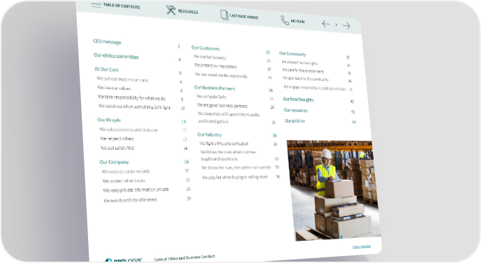 TABLE OF CONTENTS RESOURCES LAST PAGE VIEWED HELPLINE 2 CEO message 3 Our Customers 22 Our Community 37 Our ethics committee 4 We market honestly 23 We protect human rights 38 We protect our reputation 24 We care for the environment 39 At Our Core 5 We use social media responsibly 25 We give back to the community 40 We put our trust in our code 6 Our Business Partners 26 We engage responsibly in political activities 41 We live our values 8 We take responsibility for what we do 9 We compete fairly 27 Our 昀椀nal thoughts 42 We speak up when something isn’t right 10 We are good business partners 28 Our resources 43 We cooperate with government audits Our People 11 and investigations 29 Our policies 44 We value diversity and inclusion 12 Our Industry 30 We respect others 13 We 昀椀ght crime and corruption 31 We put safety 昀椀rst 14 We follow the rules when it comes Our Company 16 to gi昀琀s and courtesies 33 We keep accurate records 17 We follow the laws, everywhere we operate 35 We protect what’s ours 18 We play fair when buying or selling stock 36 We keep private information private 19 We avoid con昀氀icts of interest 20 Code of Ethics and Business Conduct Ethics Helpline