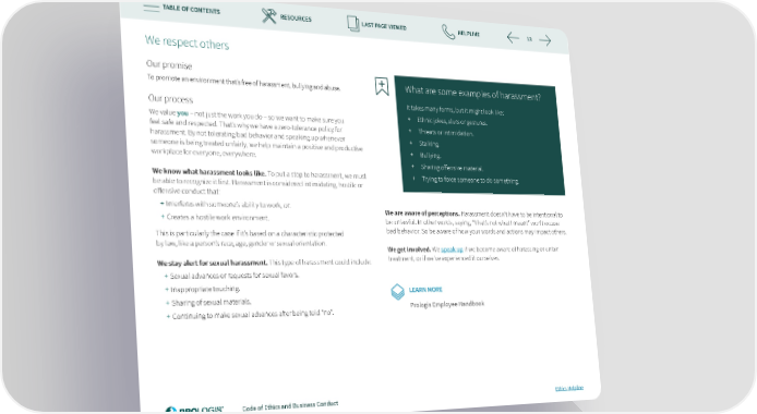 TABLE OF CONTENTS RESOURCES LAST PAGE VIEWED HELPLINE 13 We respect others Our promise To promote an environment that’s free of harassment, bullying and abuse. What are some examples of harassment? Our process It takes many forms, but it might look like: We value you – not just the work you do – so we want to make sure you + Ethnic jokes, slurs or gestures. feel safe and respected. That’s why we have a zero-tolerance policy for + Threats or intimidation. harassment. By not tolerating bad behavior and speaking up whenever + Stalking. someone is being treated unfairly, we help maintain a positive and productive + Bullying. workplace for everyone, everywhere. + Sharing o昀昀ensive material. We know what harassment looks like. To put a stop to harassment, we must + Trying to force someone to do something. be able to recognize it 昀椀rst. Harassment is considered intimidating, hostile or o昀昀ensive conduct that: + Interferes with someone’s ability to work, or. We are aware of perceptions. Harassment doesn’t have to be intentional to + Creates a hostile work environment. be unlawful. In other words, saying, “That’s not what I meant” won’t excuse This is particularly the case if it’s based on a characteristic protected bad behavior. So be aware of how your words and actions may impact others. by law, like a person’s race, age, gender or sexual orientation. We get involved. We speak up if we become aware of harassing or unfair We stay alert for sexual harassment. This type of harassment could include: treatment, or if we’ve experienced it ourselves. + Sexual advances or requests for sexual favors. + Inappropriate touching. LEARN MORE + Sharing of sexual materials. + Continuing to make sexual advances a昀琀er being told “no”. Prologis Employee Handbook Code of Ethics and Business Conduct Ethics Helpline