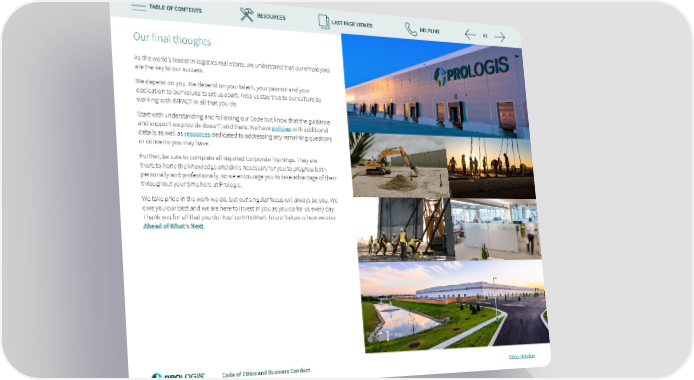 TABLE OF CONTENTS RESOURCES LAST PAGE VIEWED HELPLINE 42 Our 昀椀nal thoughts As the world’s leader in logistics real estate, we understand that our employees are the key to our success. We depend on you. We depend on your talent, your passion and your dedication to our Values to set us apart. Help us stay true to our culture by working with IMPACT in all that you do. Start with understanding and following our Code but know that the guidance and support we provide doesn’t end there. We have policies with additional details as well as resources dedicated to addressing any remaining questions or concerns you may have. Further, be sure to complete all required Corporate Trainings. They are there to hone the knowledge and skills necessary for you to progress both personally and professionally, so we encourage you to take advantage of them throughout your time here at Prologis. We take pride in the work we do, but our singular focus will always be you. We owe you our best and we are here to invest in you as you do for us every day. Thank you for all that you do. Your commitment to our Values is how we stay Ahead of What’s Next. Code of Ethics and Business Conduct Ethics Helpline