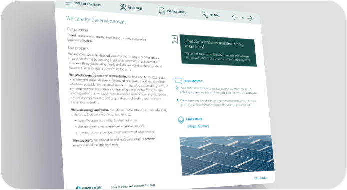 TABLE OF CONTENTS RESOURCES LAST PAGE VIEWED HELPLINE 39 We care for the environment Our promise To reduce our environmental impact and promote sustainable What does environmental stewardship business practices. mean to us? Our process We see it as our duty to address two major global challenges We’re committed to being good stewards and limiting our environmental facing us all – climate change and overburdened ecosystems. impact. We do this by pursuing sustainable construction practices in our business, through operating cleanly and e昀昀iciently and conserving natural resources. We also inspire others to do the same. We practice environmental stewardship. We 昀椀nd ways to recycle, re-use THINK ABOUT IT and conserve materials like cardboard, plastic, glass, metal and Styrofoam whenever possible. We construct new buildings using sustainability certi昀椀ed Q: I have some ideas for how to use less paper in our o昀昀ices. We’re not construction practices. We also follow all applicable environmental laws violating any laws, but I do think we could do better. Who should I talk to? and regulations as well as our procedures for sustainability in procurement, proper disposal of waste and proper disposal, handling and storing of A: We welcome any ideas for lessening our environmental impact. Explore hazardous materials. your ideas with our ESG group to see if they can be implemented. We save energy and water. Sometimes it’s the little things that make a big di昀昀erence. That’s why we always take time to: + Turn o昀昀 electronics and lights when not in use. LEARN MORE + Use energy-e昀昀icient alternatives whenever possible. Prologis ESG Policy + Turn faucets on a low 昀氀ow, then turn them o昀昀 when 昀椀nished. We stay alert. We look out for and report any actual or potential environmental hazards right away. Code of Ethics and Business Conduct Ethics Helpline