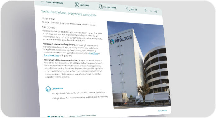 TABLE OF CONTENTS RESOURCES LAST PAGE VIEWED HELPLINE 35 We follow the laws, everywhere we operate Our promise To respect the laws that apply to our business everywhere we operate Our process We recognize that our ability to reach customers in every corner of the world is a privilege and not a right. To protect that privilege, we follow the law everywhere we work. Let’s all do our part to stay on top of what’s required so we can continue to be a world leader in our industry. We respect international regulations. Conducting business around the world can get complicated, especially when we have multiple sets of regulations, customs and practices to comply with. Whenever a con昀氀ict between laws arise, we make sure to contact our Legal Team or Compliance Team with questions. We evaluate all business opportunities. Some countries with which we do business may be subject to United States trade embargoes or economic sanctions from time to time. That’s why we evaluate these opportunities with additional scrutiny. Sometimes they are subject to stricter regulations or even prohibited altogether. And we never do business with any person or any organization that is known to support or is o昀昀icially identi昀椀ed as supporting terrorist activities. LEARN MORE Prologis Global Policy on Compliance With Laws and Regulations Prologis Global Anti-money Laundering and OFAC Compliance Policy Code of Ethics and Business Conduct Ethics Helpline