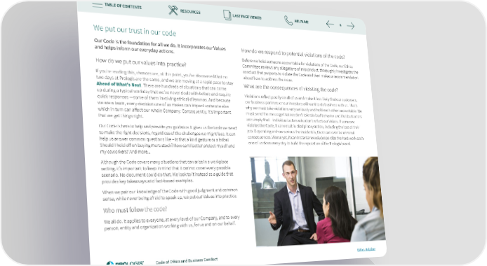 TABLE OF CONTENTS RESOURCES LAST PAGE VIEWED HELPLINE 6 We put our trust in our code Our Code is the foundation for all we do. It incorporates our Values How do we respond to potential violations of the code? and helps inform our everyday actions. Before we hold someone accountable for violations of the Code, our Ethics How do we put our values into practice? Committee reviews any allegations of misconduct, thoroughly investigates the conduct that purports to violate the Code and then makes a recommendation If you’re reading this, chances are, at this point, you’ve discovered that no about how to address the issue. two days at Prologis are the same, and we are moving at a rapid pace to stay What are the consequences of violating the code? Ahead of What’s Next. There are hundreds of situations that can come up during a typical workday that we’ve never dealt with before and require Violations re昀氀ect poorly on all of us and make it less likely that our customers, quick responses —some of them involving ethical dilemmas. And because our business partners or our investors will want to do business with us. That’s we are a team, every decision one of us makes can impact someone else why we must take violations very seriously and hold each other accountable. We which in turn can a昀昀ect our whole Company. Consequently, it’s important must send the message that we don’t tolerate bad behavior and that bad actors that we get things right. are simply that – individual actors who don’t re昀氀ect our Values. If someone Our Code is here to help and provide you guidance. It gives us the tools we need violates the Code, it can result in disciplinary action, including the loss of their to make the right decisions, regardless of the challenges we might face. It can job. Depending on how serious the incident is, there can even be criminal help us answer common questions like – Is that a kind gesture or a bribe? consequences. Worse yet, it can instantaneously jeopardize the hard work each one of us does every day to build the reputation of the Prologis brand. Should I hold o昀昀 on buying more stock? How can I better protect myself and my coworkers? And more... Although the Code covers many situations that can arise in a workplace setting, it’s important to keep in mind that it cannot cover every possible scenario. No document could do that. We look to it instead as a guide that provides key takeaways and fact-based examples. When we pair our knowledge of the Code with good judgment and common sense, while never being afraid to speak up, we put our Values into practice. Who must follow the code? We all do. It applies to everyone, at every level of our Company, and to every person, entity and organization working with us, for us and on our behalf. Code of Ethics and Business Conduct Ethics Helpline
