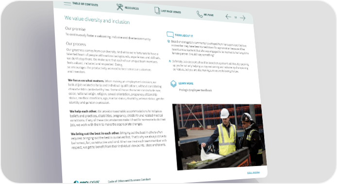 TABLE OF CONTENTS RESOURCES LAST PAGE VIEWED HELPLINE 12 We value diversity and inclusion Our promise THINK ABOUT IT To continuously foster a welcoming, inclusive and diverse community Q: Based on derogatory comments I overheard from her supervisor, I believe a coworker may have been turned down for a promotion because of her Our process recent announcement that she was engaged to be married to her long-time Our greatness comes from our diversity. And while we’re fortunate to have a female partner. Should I say something? talented team of people with various backgrounds, experiences and skill sets, A: De昀椀nitely. Job decisions should be based on a person’s abilities. By speaking we don’t stop there. We make sure that each of our unique team members up, you’re not only helping us stay welcoming and inclusive by championing feels valued, included and respected. Doing our Values, but you are also making sure we are following the law. so encourages the productivity we need to best serve our customers and investors. We focus on what matters. When making an employment decision, we LEARN MORE look at job-related criteria and individual quali昀椀cations, without considering Prologis Employee Handbook characteristics protected by law. Some of those characteristics include race, color, national origin, religion, sexual orientation, pregnancy, citizenship status, medical condition, age, marital status, disability, veteran status, gender identity and gender expression. We help each other. We provide reasonable accommodations for religious beliefs and practices, disabilities, pregnancy, childbirth and related medical conditions. If any of these circumstances make it hard for someone to do their job, we work with them to make the appropriate changes. We bring out the best in each other. Bringing out the best in others o昀琀en requires bringing out the best in ourselves 昀椀rst. That’s why we always strive to be honest, fair, constructive and kind. When we treat each team member with respect, we get to bene昀椀t from their individual viewpoints, ideas and talents. Code of Ethics and Business Conduct Ethics Helpline
