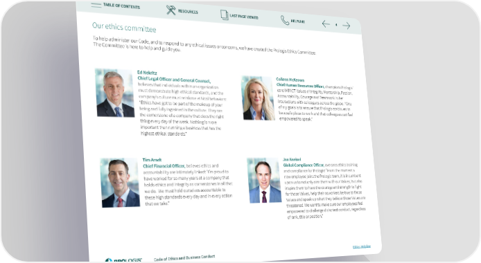TABLE OF CONTENTS RESOURCES LAST PAGE VIEWED HELPLINE 4 Our ethics committee To help administer our Code, and to respond to any ethical issues or concerns, we have created the Prologis Ethics Committee. The Committee is here to help and guide you. Ed Nekritz Colleen McKeown Chief Legal O昀昀icer and General Counsel, Chief Human Resources O昀昀icer, champions Prologis’ believes that individuals within an organization core IMPACT Values of Integrity, Mentorship, Passion, must demonstrate high ethical standards, and the Accountability, Courage and Teamwork in her company’s culture must reinforce ethical behaviors: interactions with colleagues across the globe: “One “Ethics have got to be part of the makeup of your of my goals is to ensure that Prologis continues to being and fully ingrained in the culture. They are be a safe place to work and that colleagues can feel the cornerstone of a company that does the right empowered to speak.” thing every day of the week. Nothing is more important than running a business that has the highest ethical standards.” Tim Arndt Jan Kneisel Chief Financial O昀昀icer, believes ethics and Global Compliance O昀昀icer, oversees ethics training accountability are intimately linked: “I’m proud to and compliance for Prologis: “From the moment a have worked for so many years at a company that new employee joins the Prologis team, it is incumbent holds ethics and integrity as cornerstones in all that upon us to not only arm them with our Values, but also we do. We must hold ourselves accountable to inspire them to have the courage and strength to 昀椀ght these high standards every day and in every action for those Values, help their coworkers be true to those that we take.” Values and speak up when they believe those Values are threatened. We want to make sure our employees feel empowered to challenge dishonest conduct, regardless of rank, title or position.” Code of Ethics and Business Conduct Ethics Helpline